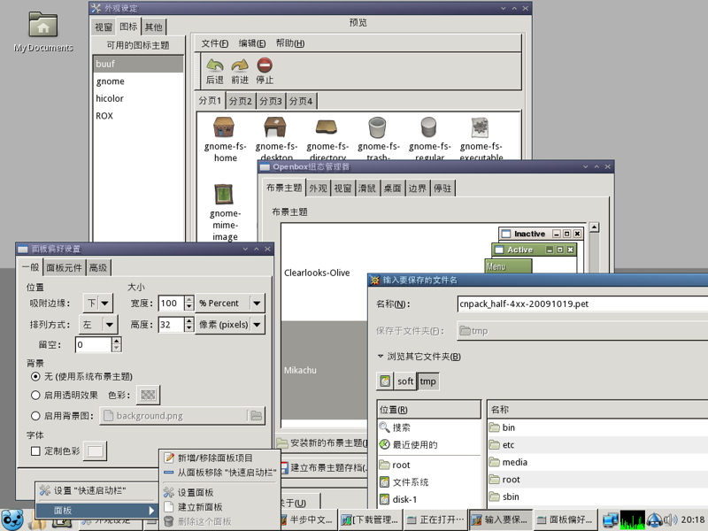 1、更新了Lxpanel为0.4Beta,可以显示出Puppy的XDG菜单和菜单顶的图标了(最新的0.5.3反而不能正确显示Puppy菜单项的图标)。